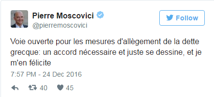«Ανοιχτός ο δρόμος για τα μέτρα ελάφρυνσης του ελληνικού χρέους : μια απαραίτητη και δίκαιη συμφωνία διαφαίνεται και το χαιρετίζω» είναι το μήνυμα που ανήρτησε στο ιστότοπο κοινωνικής δικτύωσης ο Π.Μοσκοβισί μετά την ανακοίνωση του Ντάισελμπλουμ.