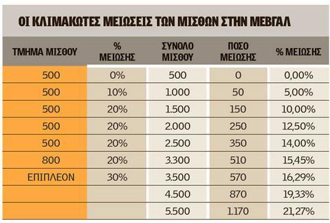 Στα επόμενα 500 ευρώ επιβάλλεται μείωση 10% (δηλαδή στα 1.000 ευρώ η μείωση είναι 50 ευρώ), τα επόμενα 500 ευρώ για μισθούς άνω των 1.000 ευρώ μειώνονται κατά 20% όπως και τα επόμενα 500 ευρώ για μισθούς πάνω από 1.500 ευρώ, τα επόμενα 500 ευρώ για μισθούς πάνω από 2.000 ευρώ και τα επόμενα 800 ευρώ για μισθούς πάνω από 2.500 ευρώ.