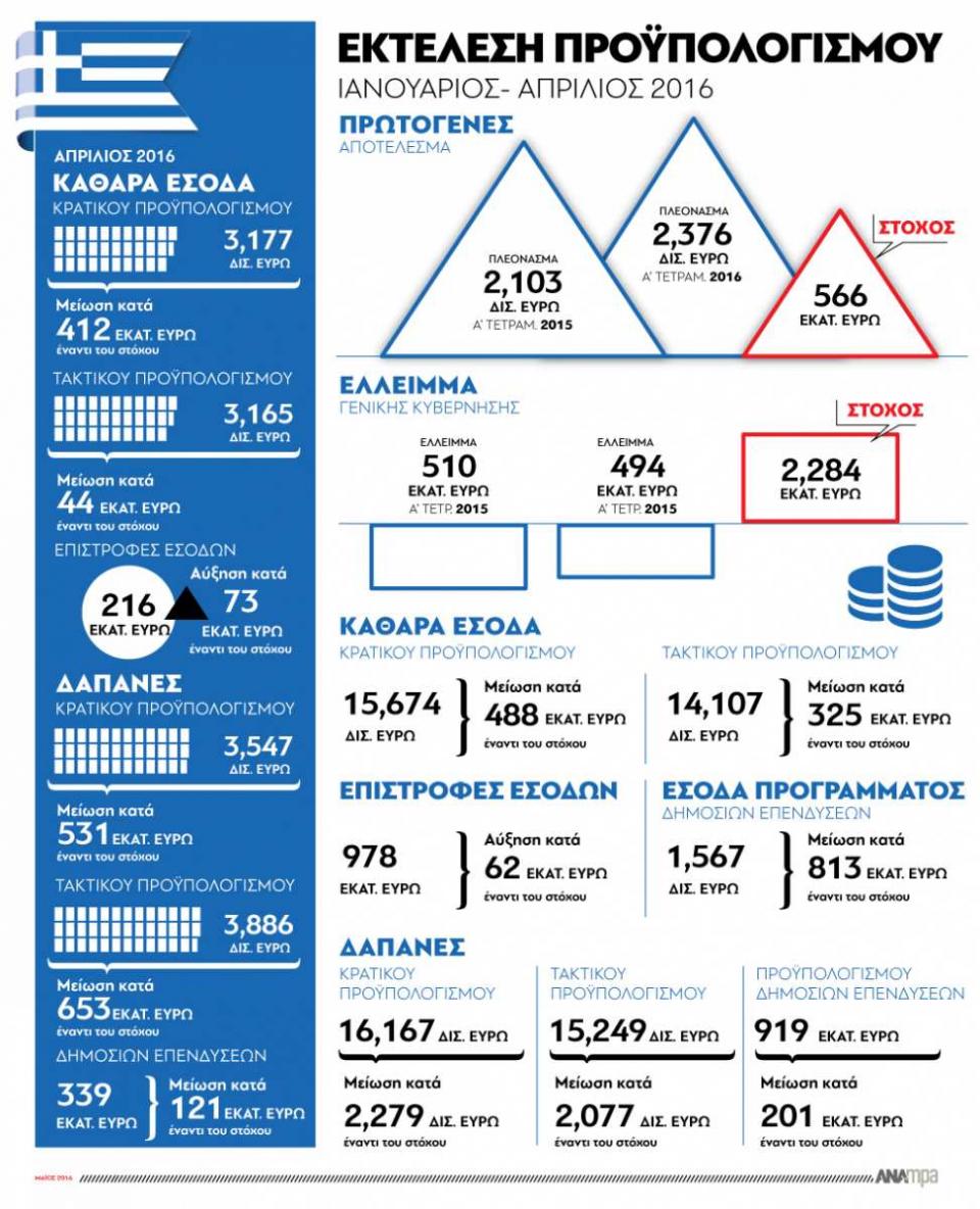 Οι δαπάνες του κρατικού προϋπολογισμού για την περίοδο Ιανουαρίου - Απριλίου 2016 ανήλθαν στα 16,167 δισ. ευρώ και παρουσιάζονται μειωμένες κατά 2,279 δισ. ευρώ έναντι του στόχου (18,446 δισ. ευρώ).
