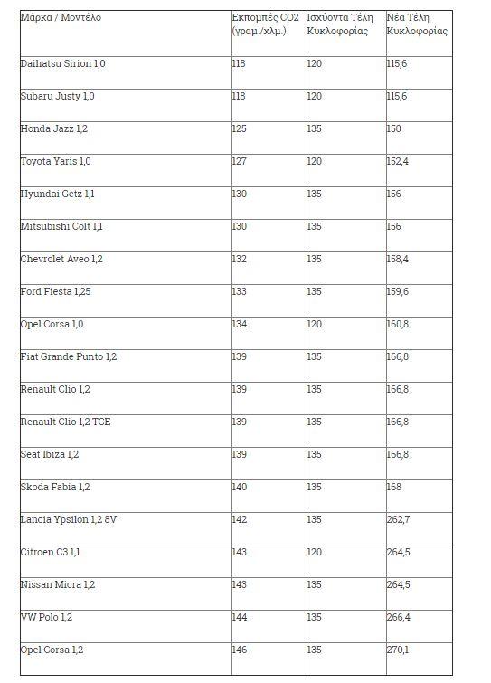 Σύμφωνα με πληροφορίες που επικαλείτα το Enikonomia.gr το οικονομικό επιτελείο εξετάζει την μείωση σε ποσοστό από 5% έως και 40% στα Τέλη Κυκλοφορίας των αυτοκινήτων με 1η Άδεια Κυκλοφορίας πριν τις 31/12/2006 και την επέκταση των Τελών Κυκλοφορίας με βάση τις εκπομπές CO2 στα αυτοκίνητα με 1η Άδεια Κυκλοφορίας από την 1η/1/2007 αλλά και αναπροσαρμογές στα ποσά που αναλογούν ανά κατηγορία εκπομπών ρύπων.