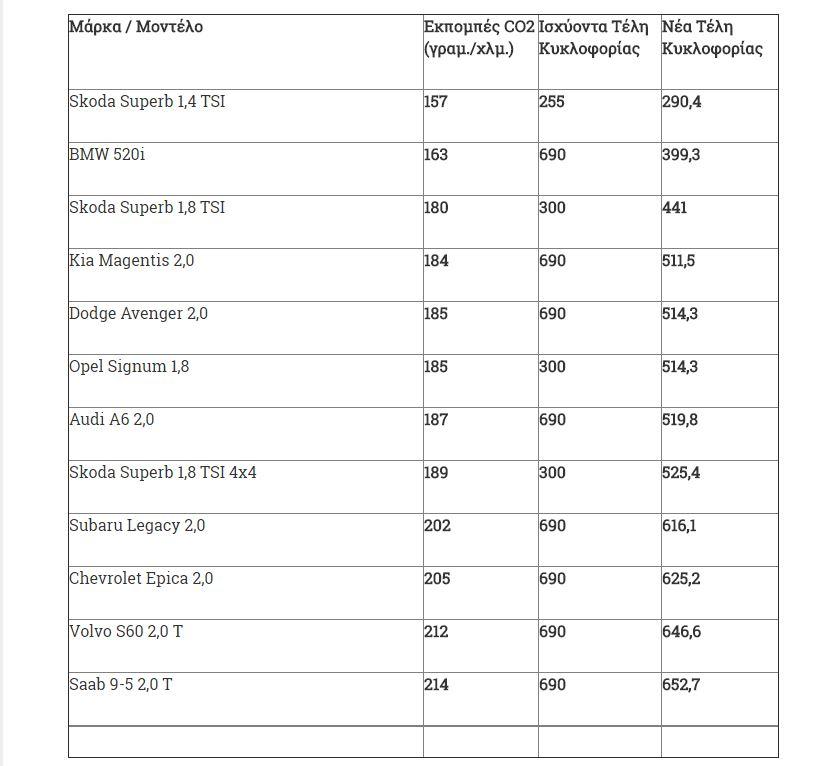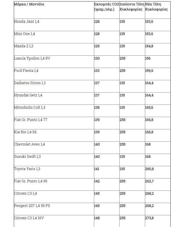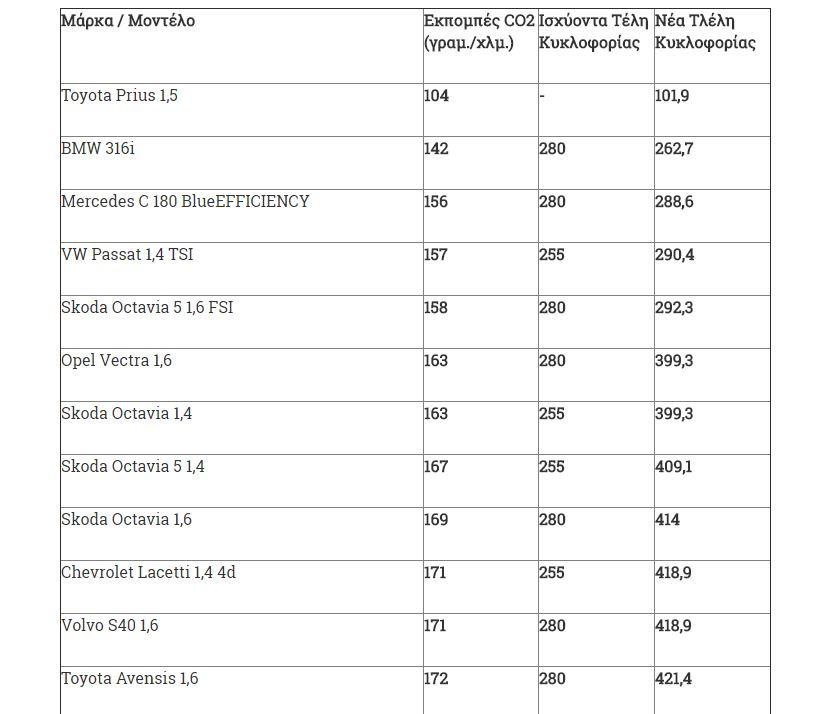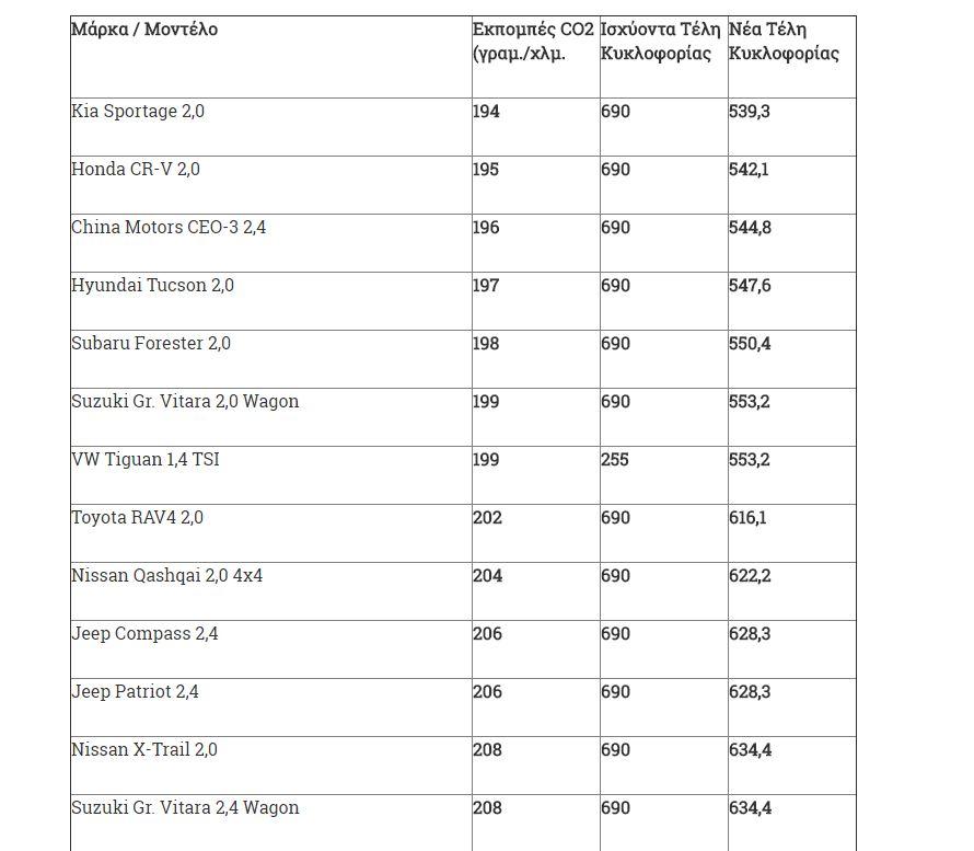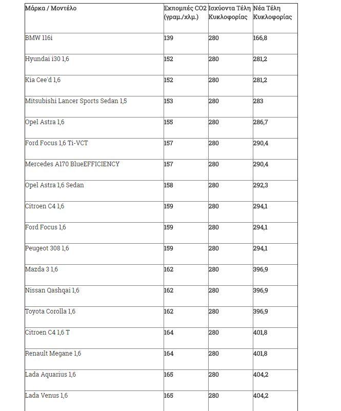 Ειδικότερα στα οχήματα με κινητήρες από 1.929 έως και 2.357 κ.εκ. τα Τέλη Κυκλοφορίας 2016 κυμάνθηκαν από 615 έως και 690 ευρώ. Σύμφωνα με το νέο σχέδιο τα Τέλη Κυκλοφορίας για τα συγκεκριμένα αυτοκίνητα αναμένεται να κυμανθεί από 492 έως και 552 ευρώ.