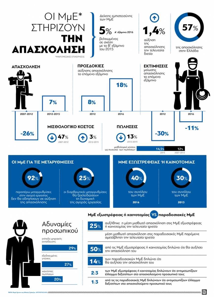 Βάσει ερωτηματολογίου σε δείγμα 1.200 επιχειρήσεων, φαίνεται ότι - μετά την καθίζηση της απασχόλησης κατά τα πρώτα χρόνια της κρίσης (-26% την περίοδο 2007-2012) - οι επιζούσες ΜμΕ πλέον αρχίζουν σταδιακά να προσλαμβάνουν, με τη μέση απασχόληση ανά επιχείρηση να αυξάνεται κατά 3% την περίοδο 2012-2015 (7% σε όρους μισθωτής απασχόλησης).