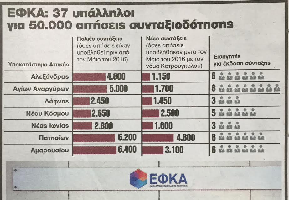 Χαρακτηριστικό είναι ότι σήμερα σε επτά καταστήματα του στην Αθήνα εργάζονται μόνο 37 υπάλληλοι εισηγητές για 50.000 αιτήσεις συνταξιοδότησης, όπως αναφέρουν Τα Νέα.
