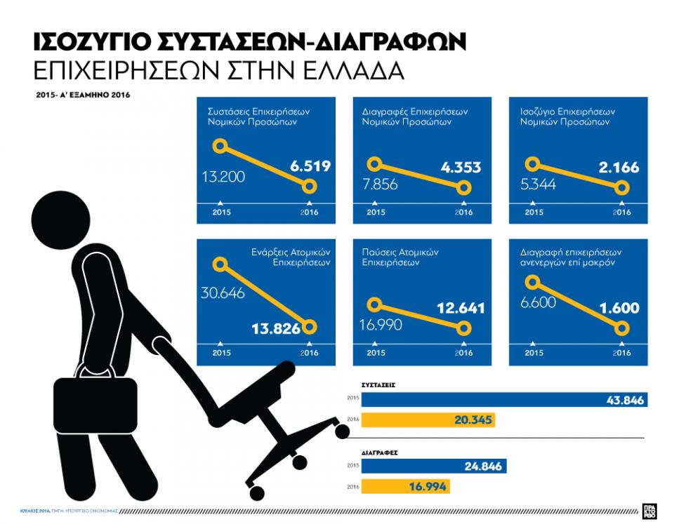 Θετικό εμφανίζεται το ισοζύγιο σύστασης και διαγραφής επιχειρήσεων το πρώτο εξάμηνο του 2016, σύμφωνα με στοιχεία του υπουργείου Οικονομίας. Ο αριθμός συστάσεων επιχειρήσεων στην Ελλάδα το 2015 ανήλθε σε 43.846 και των διαγραφών σε 24.846 ενώ το πρώτο εξάμηνο του 2016 έχουμε 20.345 συστάσεις και 16.994 διαγραφές. Την ίδια ώρα ωστόσο σε περισσότερες από 100.000 υπολογίζονται οι "νεκροζώντανες" επιχειρήσεις που υπάρχουν μόνο ως "φαντάσματα" πλέον στα μητρώα του ΓΕΜΗ και του TAXIS.