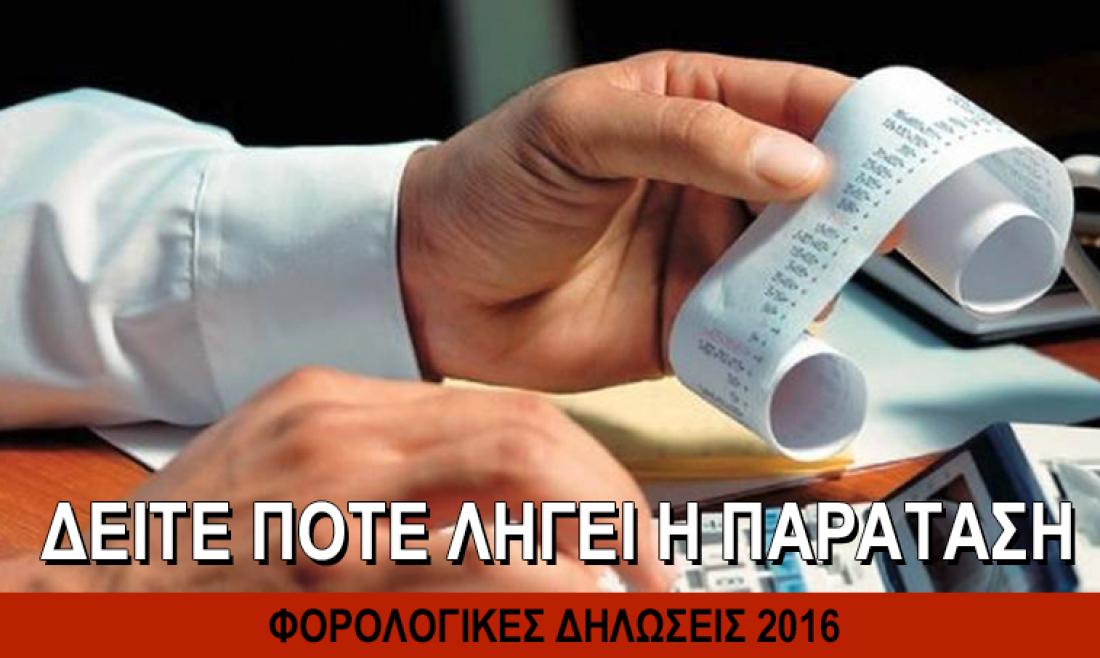Το Υπουργείο Οικονομικών εξετάζοντας την κατάσταση σχετικά με τις φορολογικές δηλώσεις που έχουν υποβληθεί και τα προβλήματα που προέκυψαν τόσο από την αποχή των φοροτεχνικών- λογιστών από την κατάθεση φορολογικών δηλώσεων, όσο και από άλλους λόγους, προχωρά σε ολιγοήμερη παράταση της καταληκτικής ημερομηνίας υποβολής τους, έως την Παρασκευή 15/7/2016. Η παράταση αφορά την υποβολή δηλώσεων τόσο των φυσικών, όσο και των νομικών προσώπων.