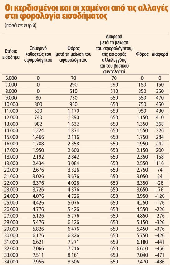 Πάνω από τις 22.000 ευρώ, η φορολογική επιβάρυνση μειώνεται παρά τη μείωση του αφορολόγητου. Το όφελος ξεκινάει από 70-120 ευρώ για τα εισοδήματα της τάξεως των 23.000-25.000 ευρώ και φτάνει έως και τα 1.300 ευρώ για τα πολύ υψηλά εισοδήματα. Για αποδοχές της τάξεως των 70-80.000 ευρώ προκύπτει όφελος της τάξεως των 700 ευρώ.