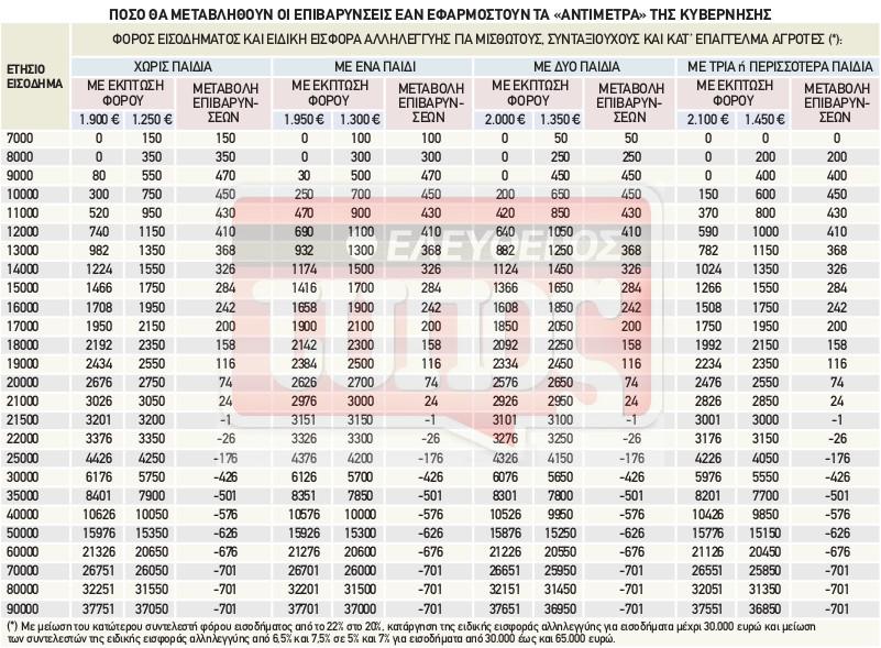 Όπως παρουσιάζει ο «Ελεύθερος Τύπος» έως και 701 ευρώ ετησίως για τους μισθωτούς, τους συνταξιούχους και τους κατ' επάγγελμα αγρότες με μεσαία και υψηλά εισοδήματα αναμένεται να προκύψουν εφόσον μαζί με τη μείωση των αφορολόγητων ορίων εφαρμοστούν και τα φορολογικά «αντίμετρα» της κυβέρνησης, τα οποία προβλέπουν τη μείωση του κατώτατου φορολογικού συντελεστή από το 22% στο 20% και την κατάργηση της εισφοράς αλληλεγγύης για τα ετήσια εισοδήματα μέχρι 30.000 ευρώ.