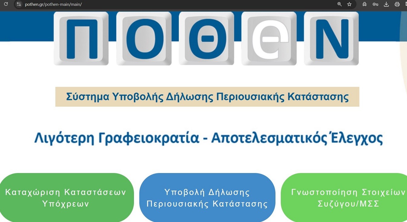 Οι ηλεκτρονικές πύλες του «pothen.gr» άνοιξαν και από την 1η Αυγούστου έχουν υποδεχθεί ήδη τις πρώτες εκατοντάδες δηλώσεις Πόθεν Έσχες για το έτος 2025 (χρήση 2024). Όπως και πέρυσι, οι σύζυγοι των υπόχρεων προσώπων καθίστανται αυτοτελώς υπόχρεοι και οφείλουν να συμπληρώσουν και να υποβάλλουν διακριτές Δηλώσεις Περιουσιακής Καταστάσεως. Δηλαδή κάνουν είσοδο στο pothen.gr και υποβάλλουν ξεχωριστά δική τους δήλωση, σαν να ήταν οι ίδιοι άμεσα υπόχρεοι, και όχι μόνον οι σύζυγοί τους!