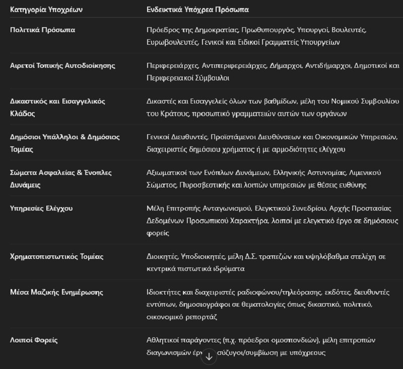 Ακολουθεί ένας -μη εξαντλητικός- κατάλογος των βασικών κατηγοριών υπόχρεων προσώπων: