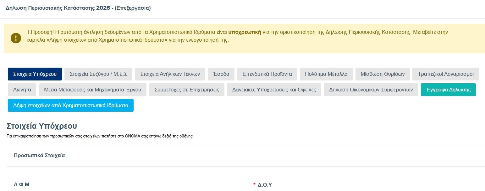 3. Επαλήθευση και συμπλήρωση: Ελέγξτε με σχολαστικότητα όλα τα προσυμπληρωμένα πεδία. Μην αρκεστείτε στην αυτόματη άντληση. Αν παρατηρήσετε ότι στοιχεία πχ από την Εθνική Τράπεζα ή την Alpha Bank (ή οποιοδήποτε άλλο ίδρυμα) λείπουν, θα πρέπει να τα εισάγετε «χειροκίνητα».
