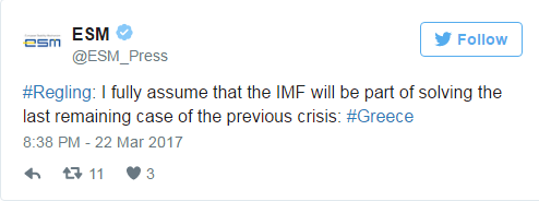 Tην εκτίμηση πως το Διεθνές Νομισματικό Ταμείο θα είναι μέρος της λύσης στην τελευταία εναπομείνασα υπόθεση της προηγούμενης κρίσης, της ελληνικής, έκανε ο επικεφαλής του Eυρωπαϊκού Μηχανισμού Σταθερότητας (ESM), Κλάους Ρέγκλινγκ.