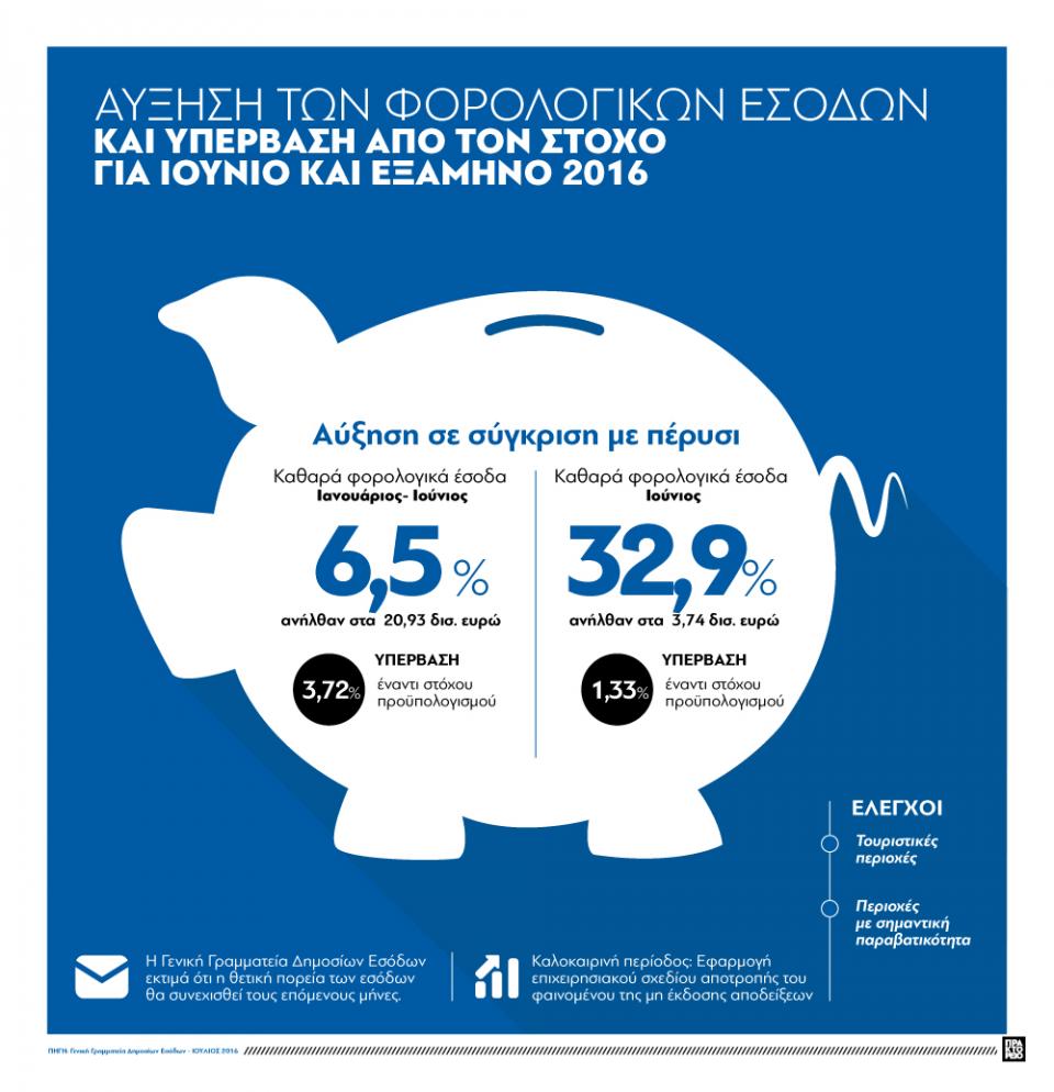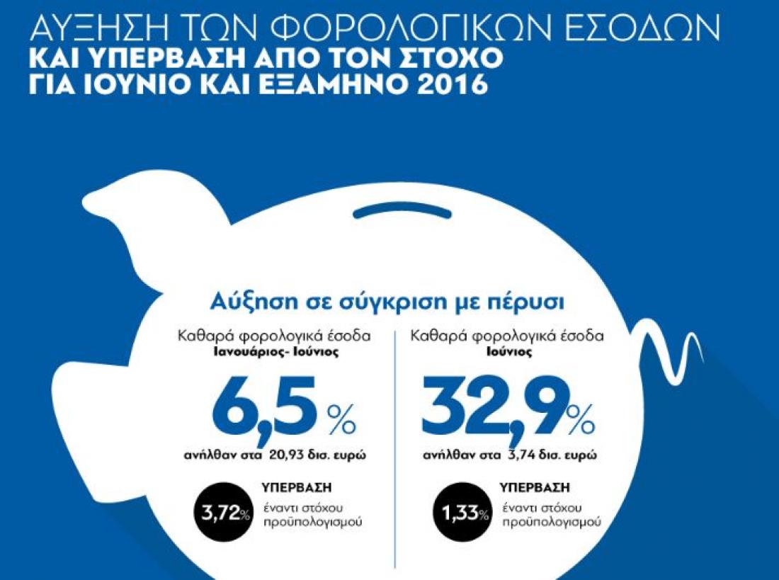 Το εξάμηνο Ιανουάριος - Ιούνιος 2016 η αύξηση των εσόδων σε σχέση πέρυσι ήταν 6,5%. Ανήλθαν στα 20,93 δισ. ευρώ παρουσιάζοντας υπέρβαση 3,72% συγκριτικά με τον στόχο του προϋπολογισμού.