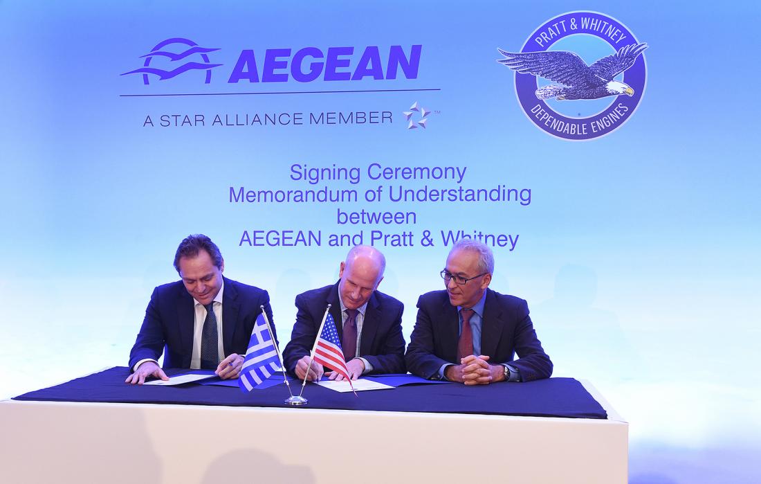 Η AEGEAN ανακοίνωσε ότι πραγματοποιήθηκε χθες (Τετάρτη) η τελετή υπογραφής προσύμφωνου (Memorandum of Understanding) με την Pratt & Whitney για τον εξοπλισμό έως και 62 αεροσκαφών Airbus νέας γενιάς της οικογένειας A320neo με τους κινητήρες GTF.