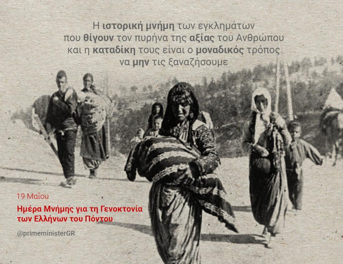 "Σήμερα, Ημέρα Μνήμης για τη Γενοκτονία των Ελλήνων του Πόντου, θυμόμαστε μια από τις πιο μαύρες σελίδες στην ιστορία της ανθρωπότητας. Αγωνιζόμαστε για τη δικαίωση της ιστορικής αλήθειας και την ειρηνική συνύπαρξη των λαών" σημειώνει στην ανάρτηση του ο πρωθυπουργός.