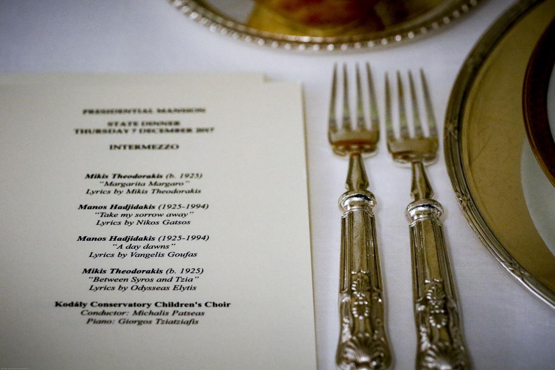 Στο επίσημο δείπνο που παρέθεσε ο Πρόεδρος της Δημοκρατίας Προκόπης Παυλόπουλος, προς τιμήν του Τούρκου προέδρου, Ρετζέπ Ταγίπ Ερντογάν, στο Προεδρικό Μέγαρο, το μενού ήταν αναμενόμενα υπερπολυτελές και μάλιστα ξεκίνησε νωρίτερα αφού οι Τούρκοι ανέφεραν ότι ο Πρόεδρος πάντα έχει συνήθειο να τρώει νωρίς. (19:30).