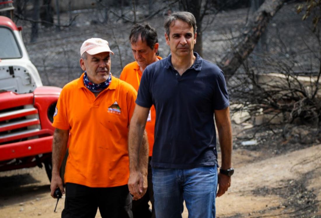 Είναι η δεύτερη φορά που ο κ. Μητσοτάκης επισκέπτεται την καμμένη περιοχή, ενώ επισκέφθηκε και το ΕΚΑΒ.