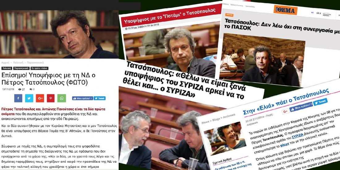 Εντύπωση καμία γιατί ο Πέτρος ...πάει παντού. Μπήκε στον πολιτικό στίβο με τον ΣΥΡΙΖΑ, την εποχή που οι "αριστεροί" αναζητούσαν ονόματα κράχτες. Τον φιλοξένησε το Ποτάμι για να καταλήξει στη ΝΔ η οποία ζητά τη θετική ψήφο της κοινωνίας με τον «ακαταμάχητο» Πέτρο Τατσόπουλο που έχει περάσει από τα μισά κόμματα της Βουλής.