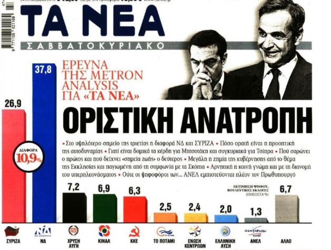Στον τίτλο της πανηγυρίζει την… οριστική ανατροπή, που ο ιδιοκτήτης της ονειρεύεται, αναφέροντας ότι η διαφορά ΣΥΡΙΖΑ – Ν.Δ. βρίσκεται «στο ψηλότερο σημείο της τριετίας». Με αποτέλεσμα να τους διαψεύσει και να τους επικρίνει δημόσια ακόμα και ο αυτουργός της δημοσκόπησης, Στράτος Φαναράς.