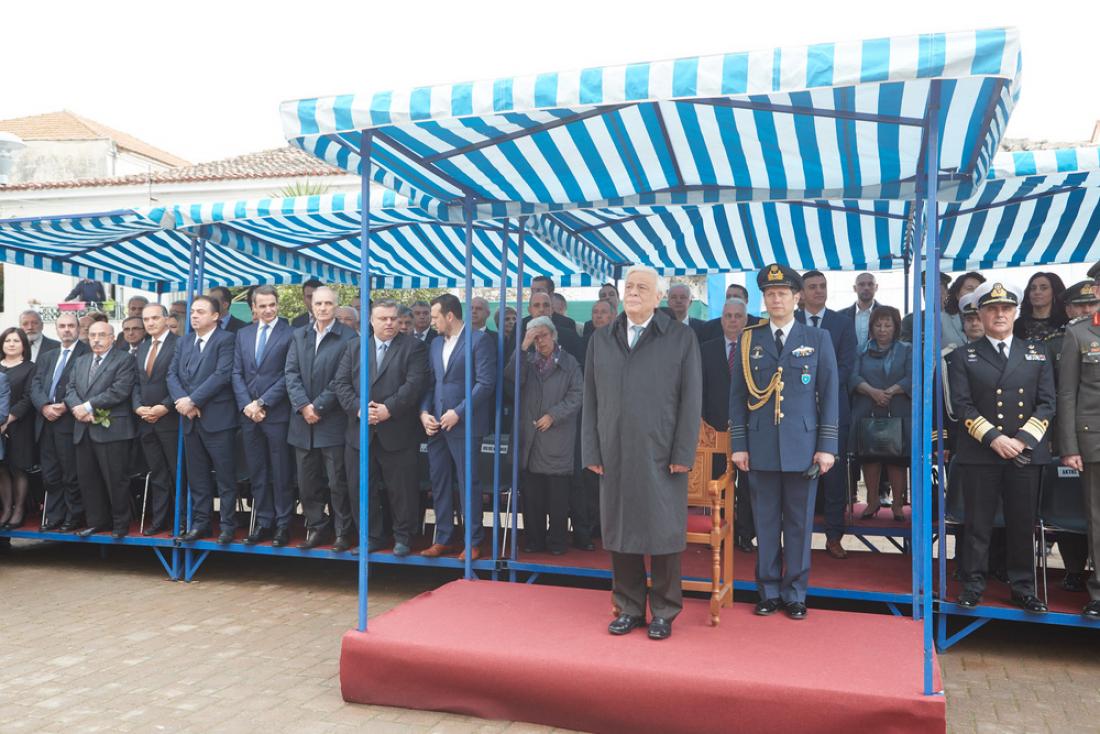 «Κάποιοι, το παρακολουθώ το τελευταίο καιρό» ανέφερε ο Πρόεδρος της Δημοκρατίας, «συνηθίζουν, αναπολώντας το παρελθόν, να μετρούν τη δύναμη των λαών και των κρατών με τα τετραγωνικά χιλιόμετρα, αλλά εμείς δεν ακολουθούμε τον ίδιο δρόμο» και εξήγησε: «Δεν διεκδικούμε ούτε μέτρο από κανέναν και δεν παραχωρούμε ούτε μέτρο από αυτό που μας ανήκει. Αλλά για μας αυτός ο αγώνας είναι ένας εθνικός αγώνας, ένας αγώνας ύπαρξης και αυτό τον αγώνα τον δίνουμε, χωρίς να φοβόμαστε κανέναν. Γιατί για μας ισχύει πάντα αυτό που ο Μεσολογγίτης μεγάλος μας και αυτός εθνικός ποιητής είχε πει για τη ψυχή και τη δύναμη των Ελλήνων. Ο Κωστής Παλαμάς είχε πει ότι "η μεγαλοσύνη των λαών δεν μετριέται με το στρέμμα, με της καρδιάς το πύρωμα μετριέται και με το αίμα". Το αίμα, το τονίζω για να μην υπάρχουν παρεξηγήσεις σε ορισμένους, το αίμα που είμαστε έτοιμοι να χύσουμε για να υπερασπιστούμε την πατρίδα μας, όχι για να διεκδικήσουμε οτιδήποτε άλλο. Αυτό προς πάσα κατεύθυνση, για να γνωρίζουν ότι είμαστε φίλοι, αλλά και αποφασισμένοι Έλληνες να υπερασπιστούμε την ιστορία μας, τα ιερά και τα όσια τούτου του τόπου».