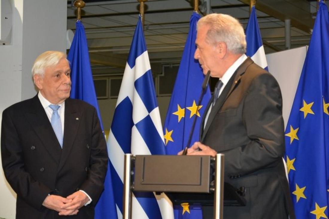 "Σας ευχαριστώ θερμώς που είστε σήμερα εδώ. Γιατί για μένα και για την πατρίδα είναι εξαιρετικά σημαντικό αυτό που συμβαίνει εδώ. Πρώτα από όλα πρέπει να ευχαριστήσω τον Επίτροπο της Ελλάδας, τον φίλο - το «Φ» με κεφαλαίο- τον Δημήτρη Αβραμόπουλο. Εάν δεν ήταν αυτός δεν θα είχα αυτήν την ιδέα. Ήταν εκείνος που μου επισήμανε την μεγάλη έλλειψη ότι δεν είχε συμβεί ποτέ αυτό που συμβαίνει σήμερα. Ζητώ από όλους σας αναδρομικά συγνώμη εκ μέρους της Ελληνικής Πολιτείας για κάτι που θα έπρεπε να είχε γίνει εδώ και καιρό. Θα ήθελα όμως να του πω ένα μεγάλο ευχαριστώ και για κάτι άλλο. Για τον τρόπο με τον οποίο ως Επίτροπος της Ευρωπαϊκής Ένωσης ασκεί τα καθήκοντά του, τιμώντας την Ευρωπαϊκή Ένωση σε αυτούς τους κρίσιμους καιρούς και με τόσο κρίσιμες αρμοδιότητες αλλά τιμώντας και την Ελλάδα. Γιατί δεν παύει ο Δημήτρης Αβραμόπουλος να είναι ο Έλληνας Επίτροπος της Ευρωπαϊκής Ένωσης. Μας κάνει περήφανους πραγματικά γιατί δεν ξέχασε σε δύσκολες ώρες την πατρίδα του και θα έρθει ο καιρός να λεχθούν αυτά που πρέπει να λεχθούν για εκείνα που έπραξε όταν έπρεπε να τα πράξει στο πλαίσιο παρά των αρμοδιοτήτων του. Αλλά τιμά την Ελλάδα και με τον τρόπο με τον οποίο ασκεί τα καθήκοντα αυτά ως Έλληνας πολιτικός. Γιατί χρειαζόταν αυτό το ταλέντο του πολιτικού για να ασκήσεις τις αρμοδιότητες σε αυτό το πλαίσιο. Τέλος, τον ευχαριστώ για κάτι άλλο το οποίο αφορά εμάς τους δύο. Έχουμε διανύσει μια κοινή πολιτική πορεία, ως βουλευτές μαζί, ως υπουργοί μαζί. Ήταν ένας άνθρωπος με τον οποίο συνυπήρξα ακόμα και σε εκλογικές μάχες, ο οποίος εξέπεμπε έναν πολιτικό πολιτισμό τον οποίο θα θυμάμαι πάντοτε και μακάρι και οι επόμενες γενιές πολιτικών να εμπνέονται. Στη μάχη την εκλογική που δίνει καθένας με τις δικές του φιλοδοξίες να εμπνέονται από τέτοια παραδείγματα. Γιατί έχουμε ανάγκη και στον τόπο μας και στην Ευρώπη γενικότερα από έναν άλλο πολιτικό πολιτισμό ιδίως σήμερα" απάντησε στο σύντομο χαιρετισμό του ο Προκόπης Παυλόπουλος.