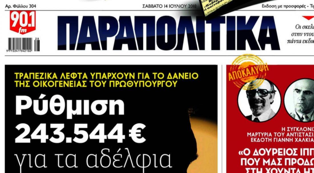 αντί απαντήσεων στις αποκαλύψεις της εφημερίδας "Παραπολιτικά " για τη χαριστική ρύθμιση δανείου της τεχνικής εταιρείας της οικογένειας του πρωθυπουργού Αλέξη Τσίπρα, επιλέγει τις γνωστές γκαιμπελικές μεθόδους και απαντά με το γνωστό χυδαίο ύφος, εκτοξεύοντας λάσπη στον ανεμιστήρα », επισημαίνει σε ανακοίνωσή της η εφημερίδα «Παραπολιτικά» απαντώντας στην ανακοίνωση που εξέδωσε νωρίτερα το γραφείο Τύπου του ΣΥΡΙΖΑ με αφορμή σημερινό πρωτοσέλιδο δημοσίευμα της εφημερίδας.