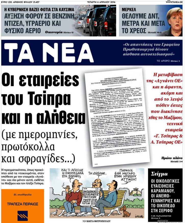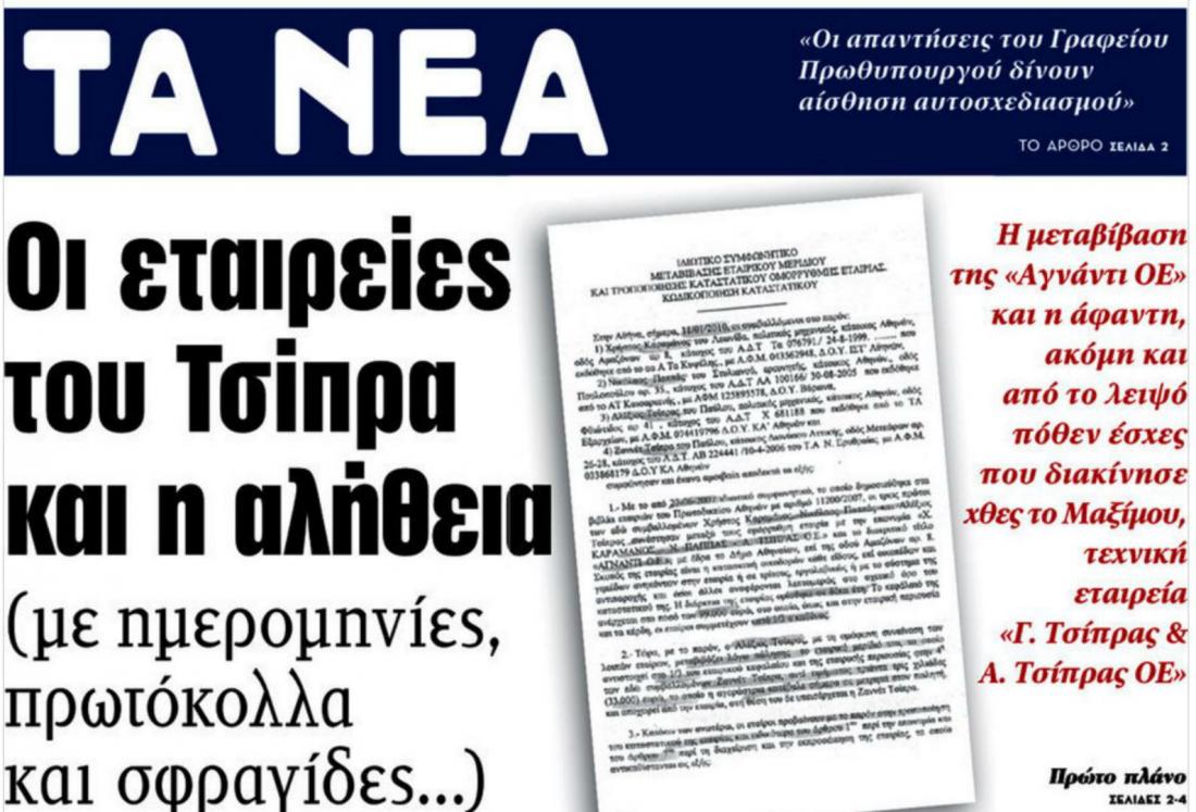 Με βασικό τίτλο στην πρώτη σελίδα «Οι εταιρείες του Τσίπρα και η αλήθεια (με ημερομηνίες, πρωτόκολλα και σφραγίδες) - Η μεταβίβαση της «Αγνάντι ΟΕ» και η άφαντη, ακόμη και από το λειψό πόθεν έσχες που διακίνησε χθες το Μαξίμου, τεχνική εταιρεία «Γ. Τσίπρας & Α.Τσίπρας ΟΕ», «ΤΑ ΝΕΑ» σημειώνουν ότι «η πραγματικότητα όπως προκύπτει από τα ντοκουμέντα, στην υπόθεση με την εταιρεία «Αγνάντι και όχι μόνον αυτή, εκθέτει το Μαξίμου και τον Α. Τσίπρα».