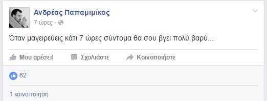 Λίγο μετά τα μεσάνυχτα της Κυριακής και ενώ η καταμέτρηση των ψηφοδελτίων για τα μέλη της Πολιτικής Επιτροπής ήταν σε εξέλιξη ο πρώην Γραμματέας του κόμματος Ανδρέας Παπαμιμίκος με ανάρτηση του στο Facebook έγραψε χαρακτηριστικά: «Όταν μαγειρεύεις κάτι για 7 ώρες θα σου βγει βαρύ...» αφήνοντας αιχμές ουσιαστικά εναντίον του Κυριάκου Μητσοτάκη, καθώς αργούσαν να ανακοινωθούν τα αποτελέσματα.
