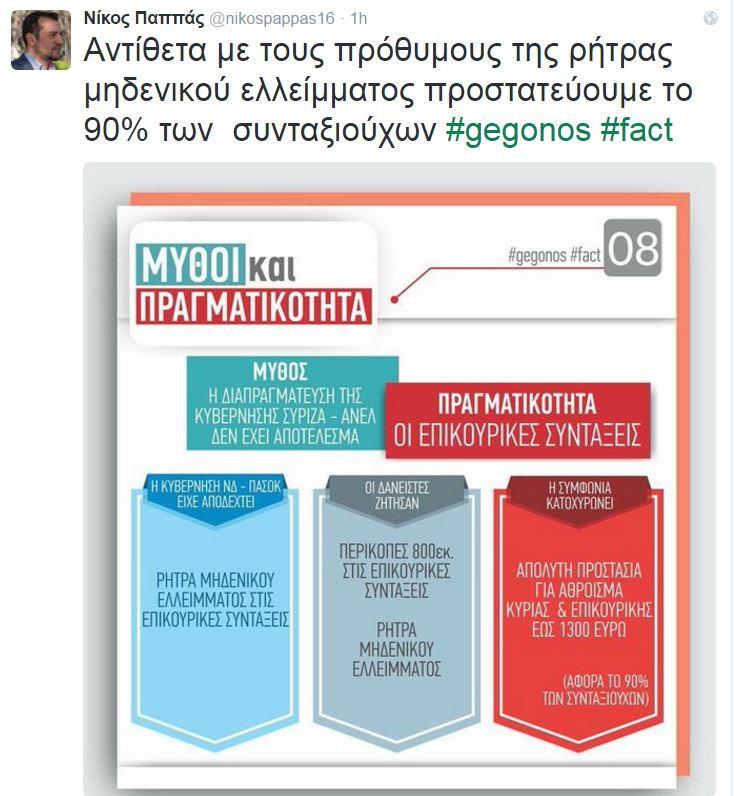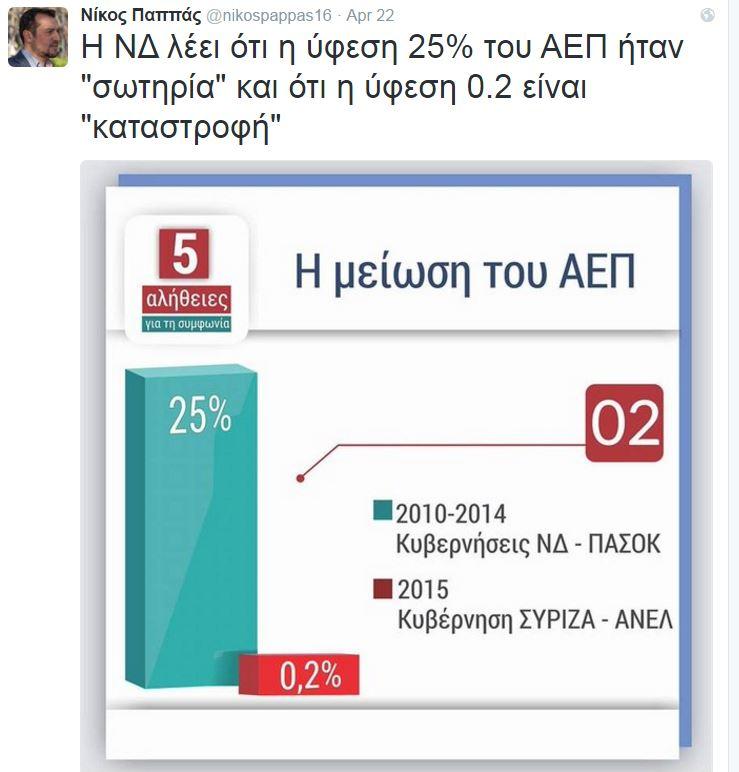 Με ένα μπαράζ αναρτήσεων και γραφημάτων στο twitter, o υπουργός Επικρατείας Νίκος Παππάς υπερσπίζεται την κυβερνητική πολιτική και τη στάση της κυβέρνησης στη διαπραγμάτευση ενώ παράλληλα επιτίθεται στη ΝΔ. Η ακατάσχετη... twittολογία του Νίκου Παππά έχει στόχο να «κρύψει» τα νέα μέτρα συνολικού ύψους 9 δισ. ευρώ (5,5 δισ. + 3,5 δισ. «προληπτικά») μέσα από το νέο φορολογικό, το νέο ασφαλιστικό τις περικοπές, την αύξηση των έμμεσων φόρων και τα άλλα μέτρα.