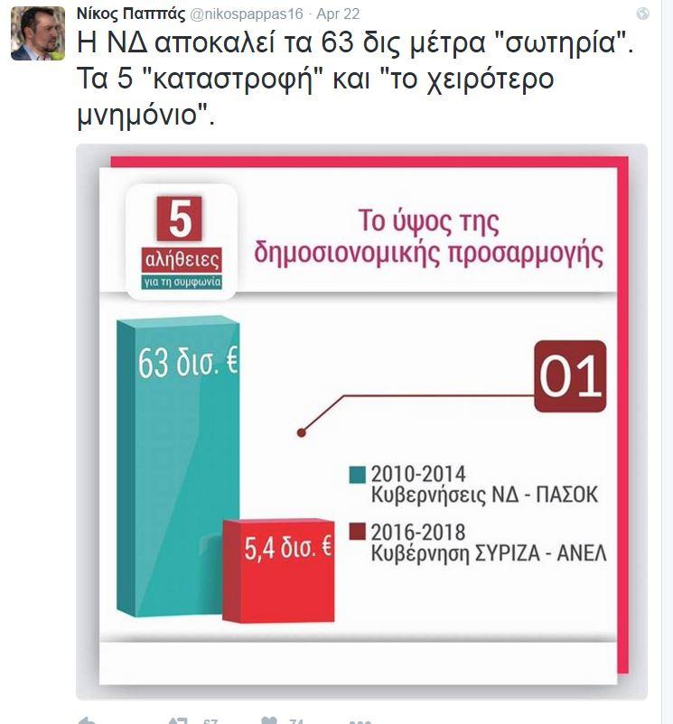 «Η ΝΔ αποκαλεί τα 63 δις μέτρα "σωτηρία". Τα 5 "καταστροφή" και "το χειρότερο μνημόνιο"».