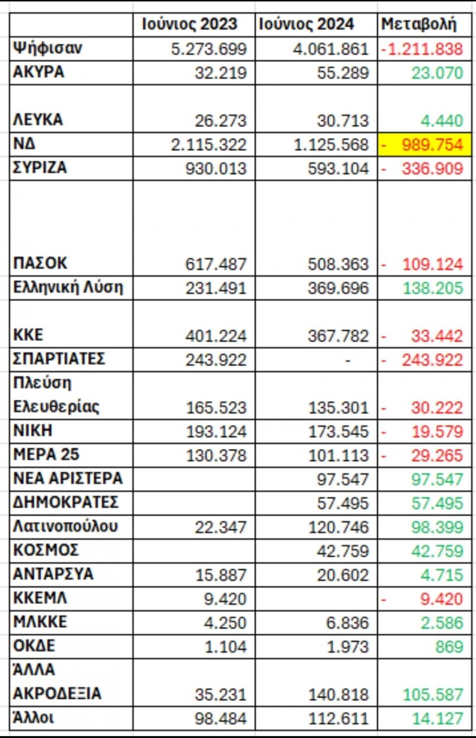 Δεύτερη «ηττημένη» η Νέα Δημοκρατία (και η κυβέρνηση). Είναι τέτοια η εκλογική επίδοση που δεν εξωραΐζεται το εκλογικό αποτέλεσμα. Μεγάλη απώλεια ψήφων για το κυβερνών κόμμα με ταυτόχρονη αύξηση των κομμάτων που είναι δεξιότερα της. Με 28,31% και 1.125.602 ψήφους η ΝΔ πέφτει 12,2% από τον Ιούνιο πέρσι και χάνει σχεδόν ένα εκατομμύριο ψήφους (από 2.115.322). Μάλιστα, τον Μάιο του 2023 είχε πάρει 2.407.750 ψ. (40,79%). Ακόμα και σε σχέση όμως με τις ευρωεκλογές του 2019 (33,12%, 1.873.137 ψήφοι) η ΝΔ έχει μεγάλη πτώση. Από την άλλη Η Λογική Φωνή με την (ευρωβουλευτίνα πλέον) Αφροδίτη Λατινοπούλου «αλίευσε» ψήφους από τη δεξαμενή της ΝΔ. Από τις 22.347 ψήφους τον Ιούνιο του 2023 έφτασε τις 120.746 φέτος. Γάμος ομοφύλων και φορολογικό οδήγησαν παραδοσιακούς δεξιούς ψηφοφόρους στη Φωνή Λογικής.