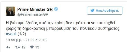 «Η βιώσιμη έξοδος από την κρίση δεν πρόκειται να επιτευχθεί χωρίς τη δημοκρατική μεταρρύθμιση του πολιτικού συστήματος», τονίζει ο πρωθυπουργός Αλέξης Τσίπρας, με αναρτήσεις του στο Twitter ενόψει της ομιλίας του στη Βουλή.