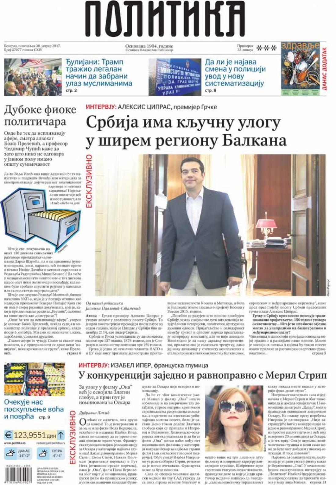 Την πεποίθησή του ότι «σύντομα θα διευθετηθεί η εκκρεμότητα» της διαπραγμάτευσης διατυπώνει ο πρωθυπουργός Αλέξης Τσίπρας σε αποκλειστική συνέντευξη που παραχώρησε στην έγκριτη σερβική εφημερίδα «Πολίτικα», ενόψει της αυριανής επίσημης επίσκεψής του στο Βελιγράδι. Ο πρωθυπουργός διαπιστώνει τις «παράλογες απαιτήσεις» από μέρος των πιστωτών, εκτιμά ωστόσο ότι «κανέναν στην Ευρώπη δεν συμφέρει ενδεχόμενη νέα αναβίωση του ελληνικού προβλήματος».