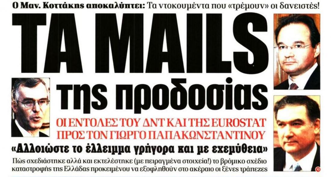 Στις ενολές του ΔΝΤ και της Eurostat, προς την κυβέρνηση του Γ. Παπανδρέου και τον τότε υπουργό Οικονομικών Γ. Παπακωνσταντίνου, για την αλλοίωση των στοιχείων του ελλείμματος «γρήγορα και με εχεμύθεια», αναφέρεται στο σημερινό πρωτοσέλιδό της η εφημερίδα Δημοκρατία. Το θέμα υπογράφει ο δημοσιογράφος Μανώλης Κοττάκης.