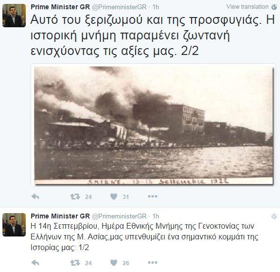 "Η 14η Σεπτεμβρίου, Ημέρα Εθνικής Μνήμης της Γενοκτονίας των Ελλήνων της Μ. Ασίας, μας υπενθυμίζει ένα σημαντικό κομμάτι της Ιστορίας μας: Αυτό του ξεριζωμού και της προσφυγιάς", τονίζει ο Αλέξης Τσίπρας σε αναρτήσεις του στο Twitter, για να υπογραμμίσει: