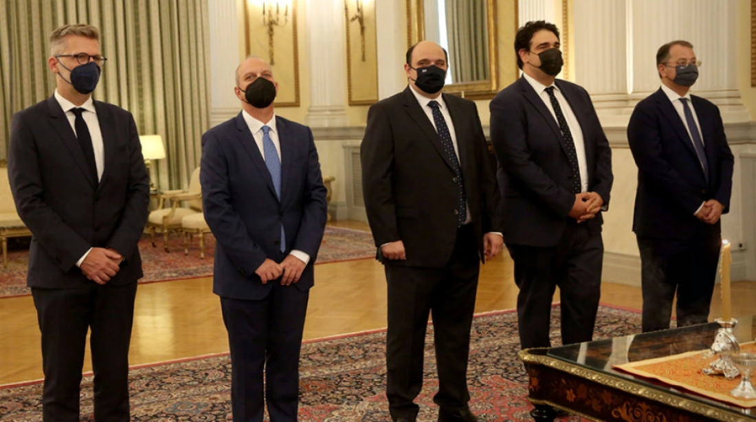 Ενώπιον της Προέδρου της Δημοκρατίας Κατερίνας Σακελλαροπούλου και παρουσία του πρωθυπουργού Κυριάκου Μητσοτάκη, ορκίσθηκαν στο Προεδρικό Μέγαρο οι πέντε υπουργοί και υφυπουργοί - όλοι με θρησκευτικό όρκο.