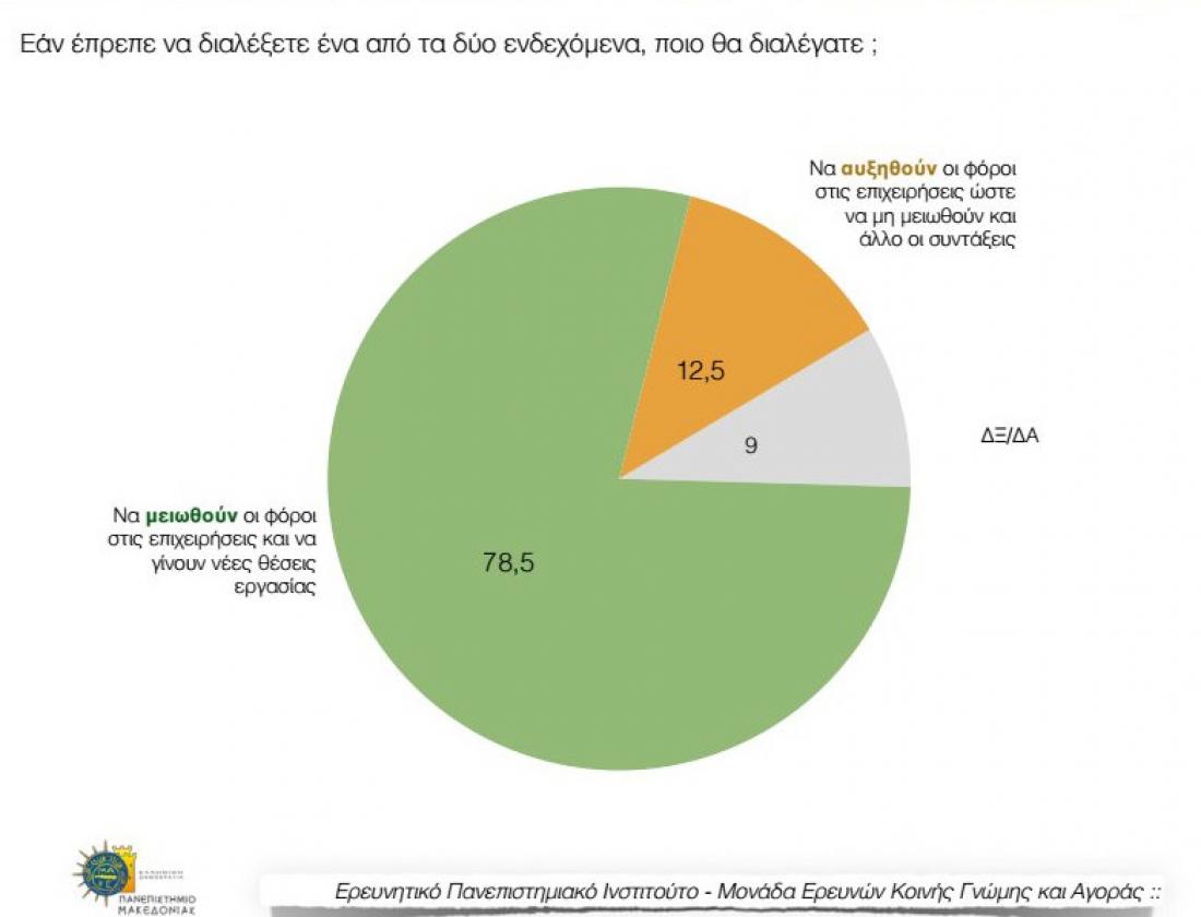 Τη μείωση των φόρων στις επιχειρήσεις και δημιουργία νέων θέσεων εργασίας ζητά το 78,5% των ερωτηθέντων σε δημοσκόπηση του πανεπιστημίου Μακεδονίας. Το 12,5% δηλώνει ότι θέλει να αυξηθούν οι φόροι στις επιχειρήσεις, ώστε να μη μειωθούν και άλλο οι συντάξεις.