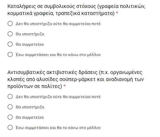 Στο ζήτημα της κατάληψης κτιρίων (ιδιωτικών, κομμάτων, τραπεζών) ζητείται απάντηση υποστήριξης, συμμετοχής ή απόρριψης, διευρύνεται καθώς σε επόμενη ερώτηση διευκρινίζεται ο στόχος, ενώ στο τέλος γίνεται αναφορά για το αν ο ερωτώμενος θα συμμετείχε στο μέλλον σε καταλήψεις.