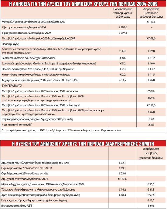 Eίναι πολύ άδικο να ρίχνει κανείς την ευθύνη για τη διόγκωση του δημόσιου χρέους στην περίοδο 2004-2009. Η ανάλυση των αριθμών δείχνει ότι η αύξηση οφείλεται σε μεγάλο βαθμό στο υψηλό χρέος που είχε ήδη δημιουργηθεί τα προηγούμενα 20 χρόνια και σε ηθελημένη απόκρυψη δανείων της κυβέρνησης Σημίτη. Παράλληλα με ανακατασκευή των δημοσιονομικών δεδομένων για το έλλειμμα του 2009 η κυβέρνηση Γ. Παπανδρέου χρέωσε πολλά δισ. στη Ν.Δ., θέμα πλέον που διερευνά η Δικαιοσύνη.