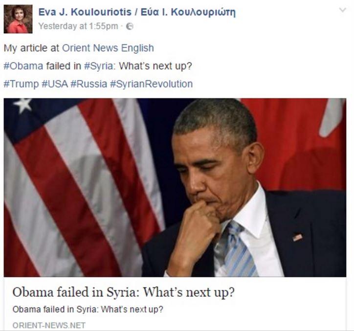 Η κα Εύα Κουλουριώτη, η οποία ορίσθηκε, από την σημερινή ηγεσία της ΝΔ, μέλος της Γραμματείας Γυναικείων Θεμάτων, υπογράφει το άρθρο με την ιδιότητα της πολιτικής αναλύτριας, ειδικής σε θέματα Μέσης Ανατολής. Είναι γραμμένο στα αγγλικά και δημοσιεύθηκε στην ιστοσελίδα orient-news, στις 9 Νοεμβρίου, με τον τίτλο " Ο Ομπάμα απέτυχε στη Συρία: Τι ακολουθεί;".
