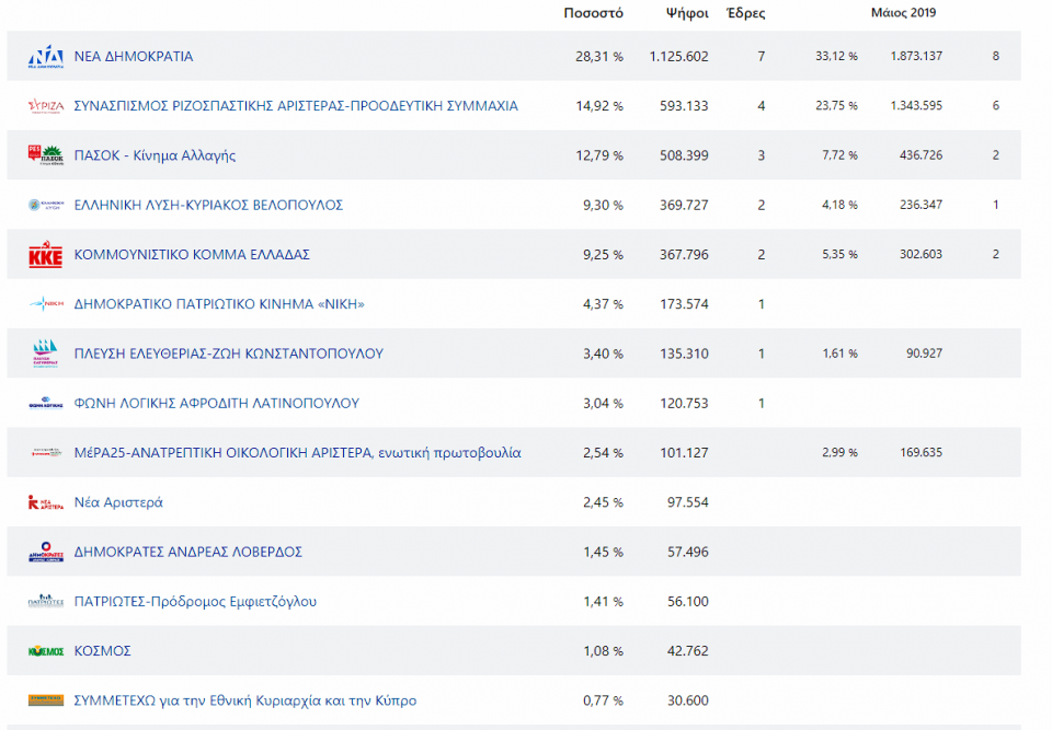 Πρωτιά της ΝΔ με διαφορά 13 μονάδων έναντι του ΣΥΡΙΖΑ, αλλά με εκατέρωθεν απώλειες σχεδόν κατά 5,5% και 9% αντίστοιχα και άνοδο των κομμάτων που κινούνται στα δεξιά της πολιτικής κλίμακας, καθώς και της αποχής που αγγίζει το 60% κατέγραψαν τα αποτελέσματα των ευρωεκλογών στην Ελλάδα.