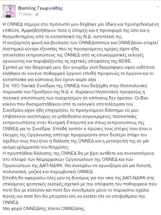 Όπως ανακοίνωσε ο Πρόεδρος της Κεντρικής Επιτροπής Δεοντολογίας κ. Απόστολος Κράτσας, ο κ. Βασίλης Γεωργιάδης διεγράφη από μέλος του Κόμματος και ως εκ τούτου εξέπεσε αυτοδίκαια από το αξίωμα του Προέδρου της ΟΝΝΕΔ, καθώς και από κάθε άλλη κομματική ιδιότητα.