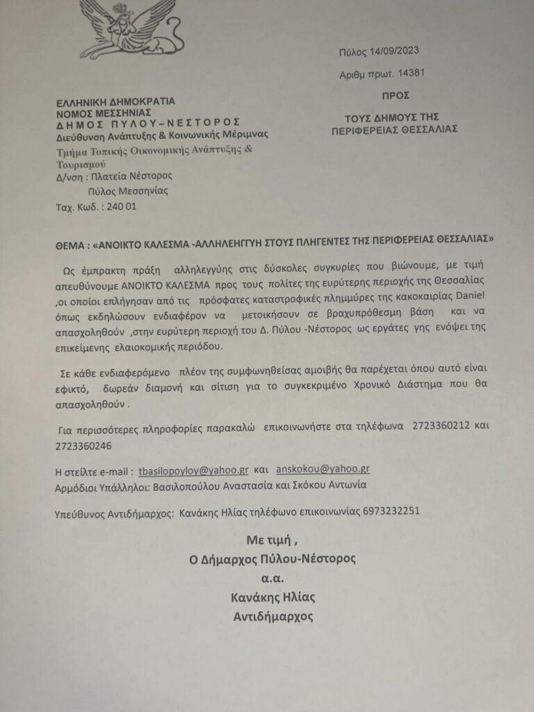 Η απεύθυνση αυτή, που χαρακτηρίζεται από τον Δήμο Πύλου ως... «κίνηση αλληλεγγύης», έρχεται την ώρα που οι πληγέντες θρηνούν ανθρώπινες ζωές ενώ προσπαθούν να σταθούν στα πόδια τους την επόμενη μέρα, ζητώντας από την κυβέρνηση και το κράτος ουσιαστική βοήθεια.