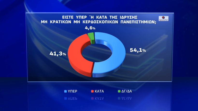 Διχασμένη δείχνει η κοινωνία για το ζήτημα των ιδιωτικών πανεπιστημίων. «Ναι» στην ίδρυση μη κρατικών, μη κερδοσκοπικών Πανεπιστημίων λένε οι πολίτες σε ποσοστό 54,1% - σύμφωνα με δημοσκόπηση της Opinion Poll που παρουσίασε απόψε το κεντρικό δελτίο Ειδήσεων του Action 24. Αντίθετη άποψη εκφράζει ένα υψηλό ποσοστό που φθάνει στο 41,3%.
