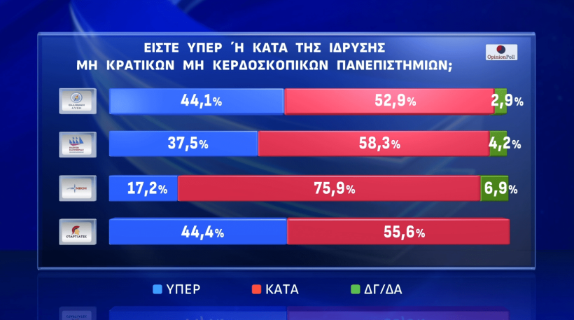Ενδιαφέροντα ευρήματα για την άποψη της κοινής γνώμης αναφορικά με την ίδρυση ιδιωτικών - μη κρατικών - πανεπιστημίων, περιλαμβάνονται σε δημοσκόπηση της OPINION POLL για λογαριασμό του ACTION 24.