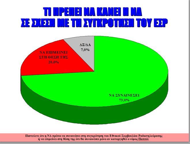 Το 73% των πολιτών πιστεύει ότι η ΝΔ πρέπει να συναινέσει στη συγκρότηση του ΕΣΡ και να μην επιμείνει στην θέση της, για συμφωνία μετά την κατάργηση του νόμου Παππά, σύμφωνα με έρευνα της Alco για το News247.