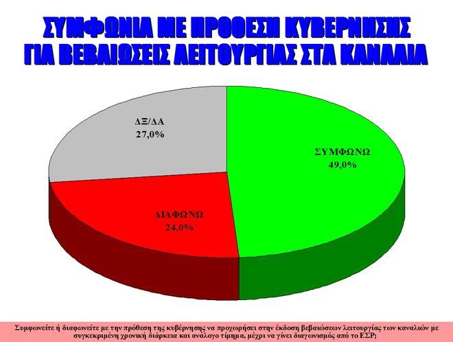 Επίσης, το 50% συμφωνεί με την πρόθεση της κυβέρνησης να προχωρήσει στην έκδοση βεβαιώσεων λειτουργίας των καναλιών με συγκεκριμένη χρονική διάρκεια και ανάλογο τίμημα, μέχρι να γίνει ο διαγωνισμός από το ΕΣΡ.