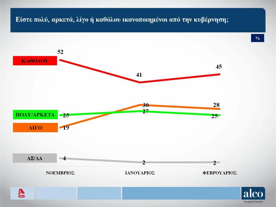 Καθόλου ικανοποιημένο από την κυβέρνηση δηλώνει το 45% των ερωτηθέντων, ενώ το 28% απαντά «λίγο» και το 25% «πολύ/αρκετά».