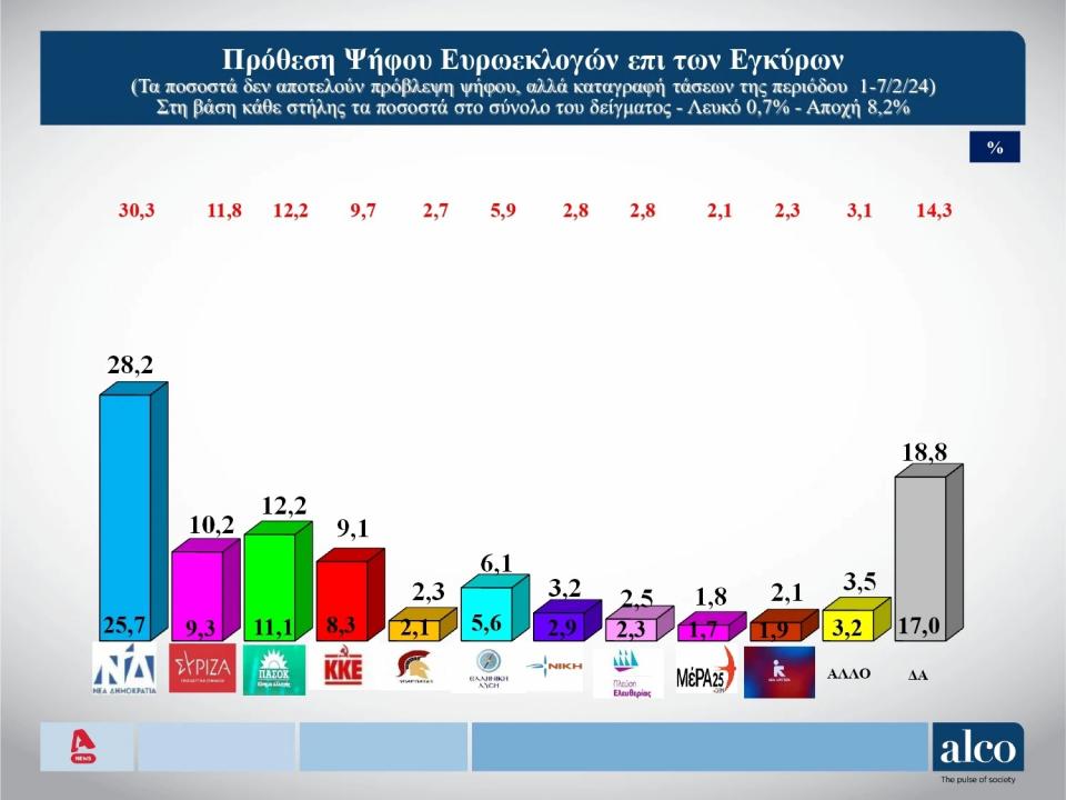 Με 16 μονάδες διαφορά προηγείται η Νέα Δημοκρατία στην πρόθεση ψήφου για τις ευρωεκλογές, σύμφωνα με την δημοσκόπηση της Alco για λογαριασμό του Alpha.