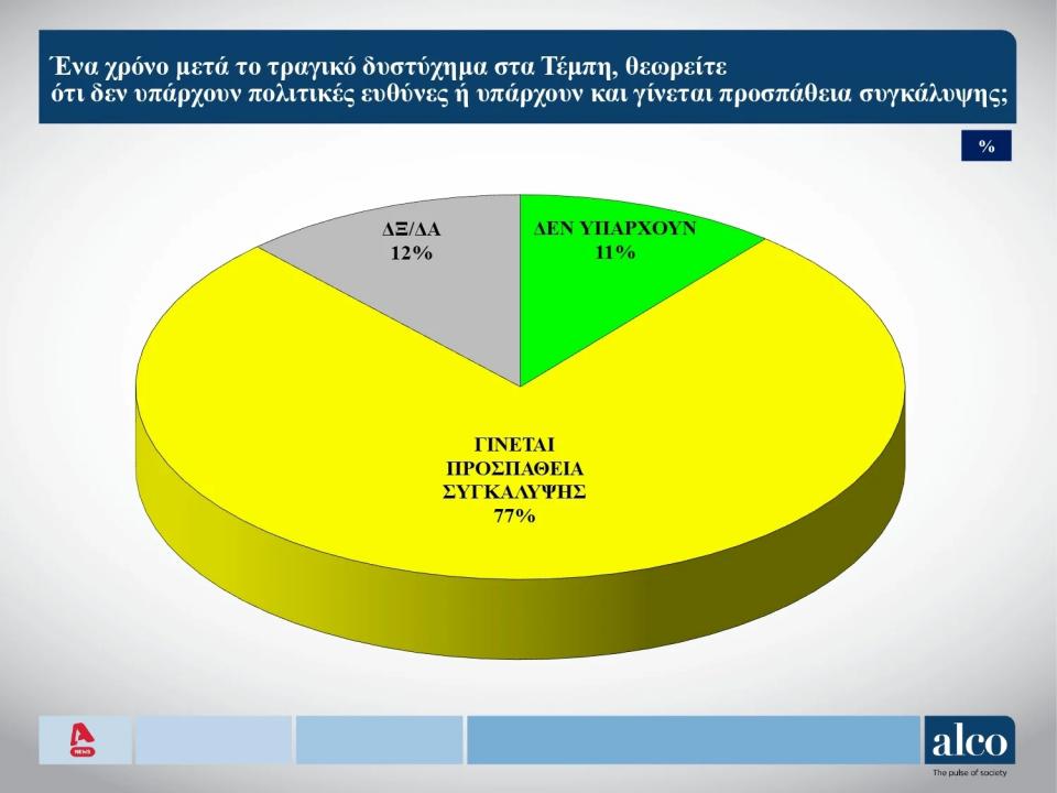Σε ερώτηση σχετικά με τη σιδηροδρομική τραγωδία των Τεμπών, οι πολίτες απαντούν σε ποσοστό 77% ότι «γίνεται προσπάθεια συγκάλυψης» και το 11% ότι «δεν υπάρχουν πολιτικές ευθύνες». Το 12% απαντά «δεν γνωρίζω/δεν απαντώ».
