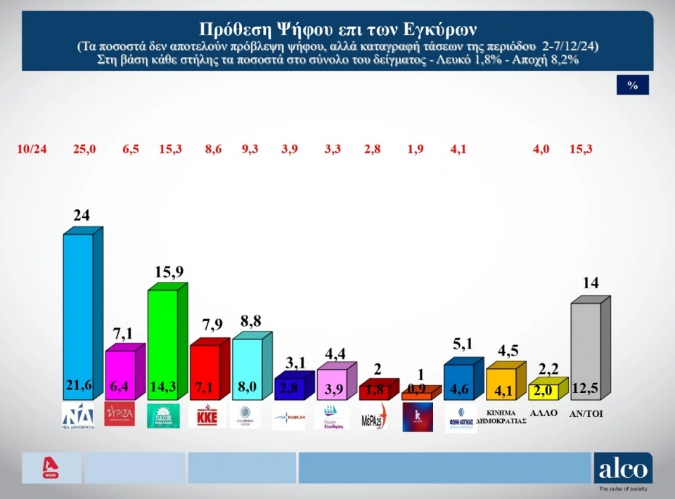 Στην πρόθεση ψήφου επί των εγκύρων, η Νέα Δημοκρατία καταλαμβάνει το 24%, ο ΣΥΡΙΖΑ το 7,1%, το ΠΑΣΟΚ το 15,9%, το ΚΚΕ το 7,9%, η Ελληνική Λύση το 8% και η Πλεύση Ελευθερίας το 4,4%. Η Νίκη βρίσκεται στο 3,1%, το πρωτοεμφανιζόμενο Κίνημα Δημοκρατίας στο 4,5% ενώ η Φωνή Λογικής, 5,1%.